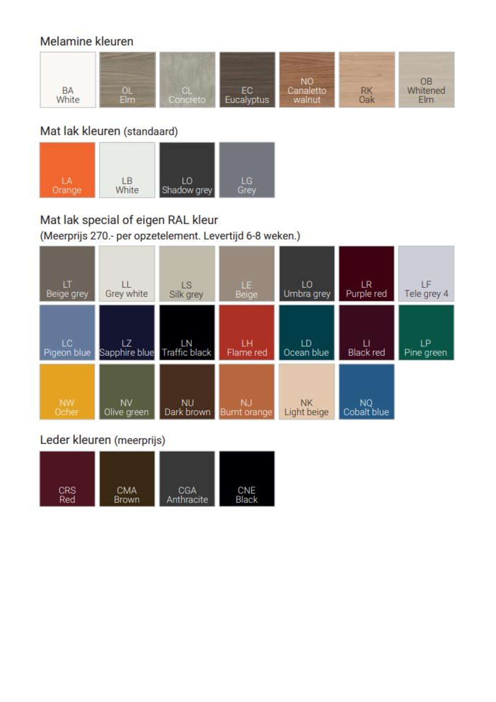 - De opzet elementen zijn leverbaar in melamine, leder of lak. In diverse kleuren
